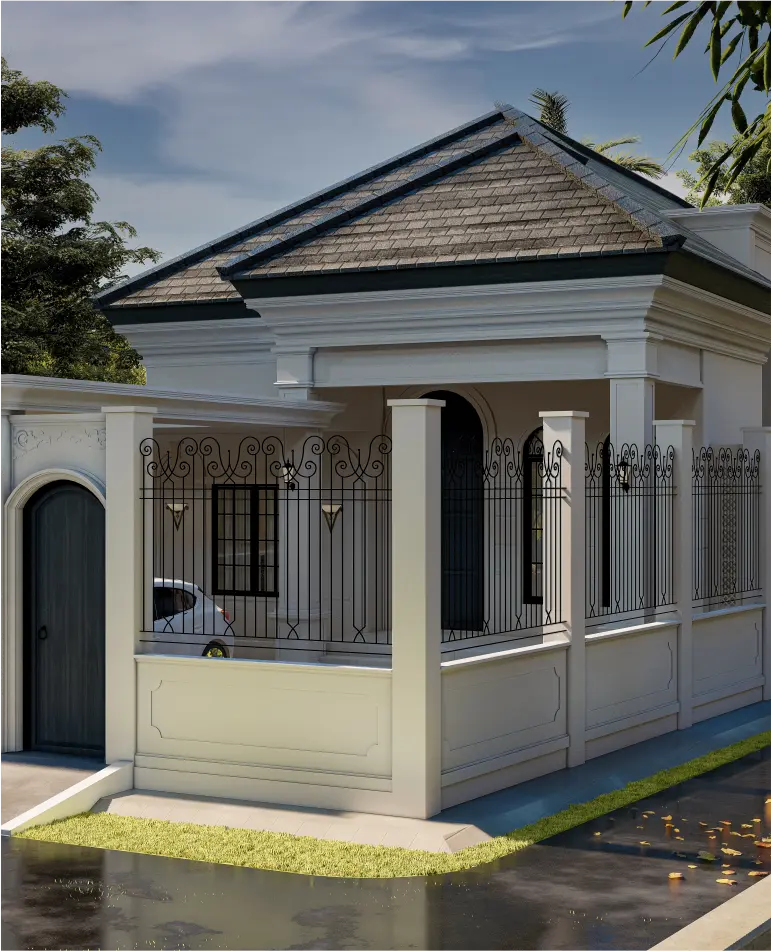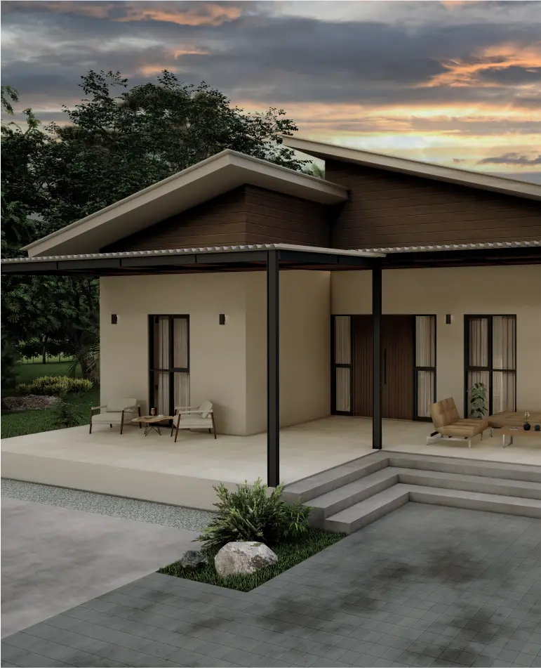 View ProjectPerancangan rumah tinggal satu lantai dengan pendekatan tropis modern yang mengutamakan kehangatan material alami, kenyamanan iklim, dan tampilan yang elegan. Fasad bangunan memadukan elemen batu alam....