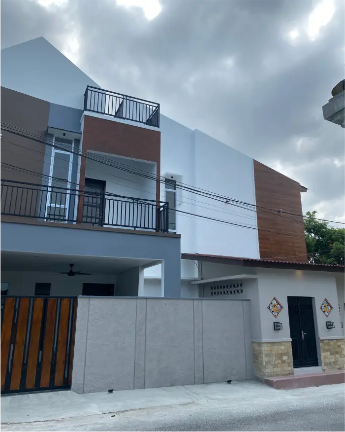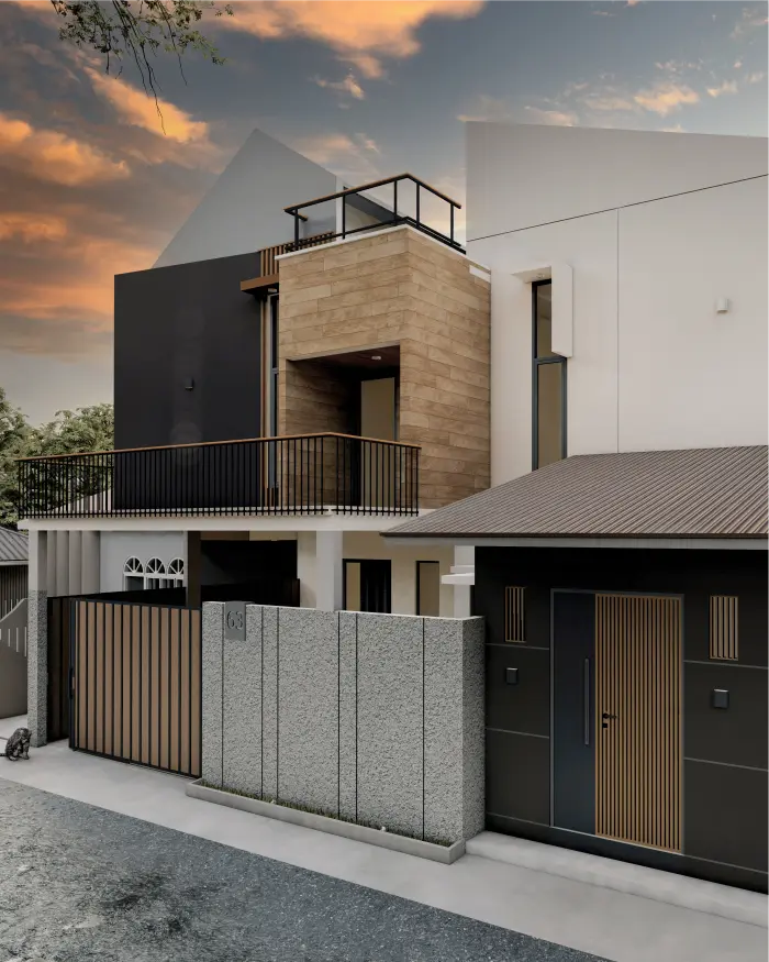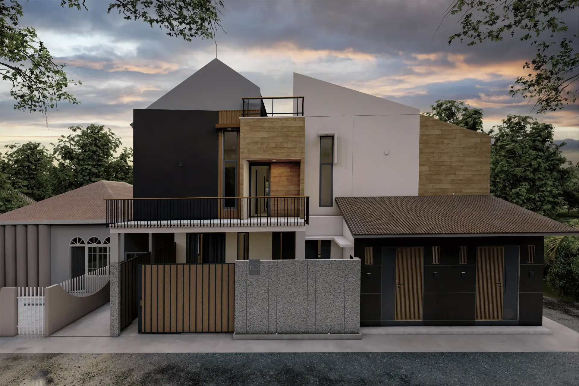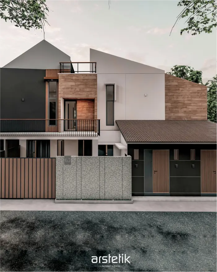 Penggunaan warna monokrom gelap–terang, dipadukan dengan aksen batu alam bertekstur dan elemen kayu, memberikan karakter hangat sekaligus tegas. Detail bidang miring pada atap dan dinding memperkuat estetika modern, menghadirkan siluet arsitektur yang unik di kawasan hunian urban.