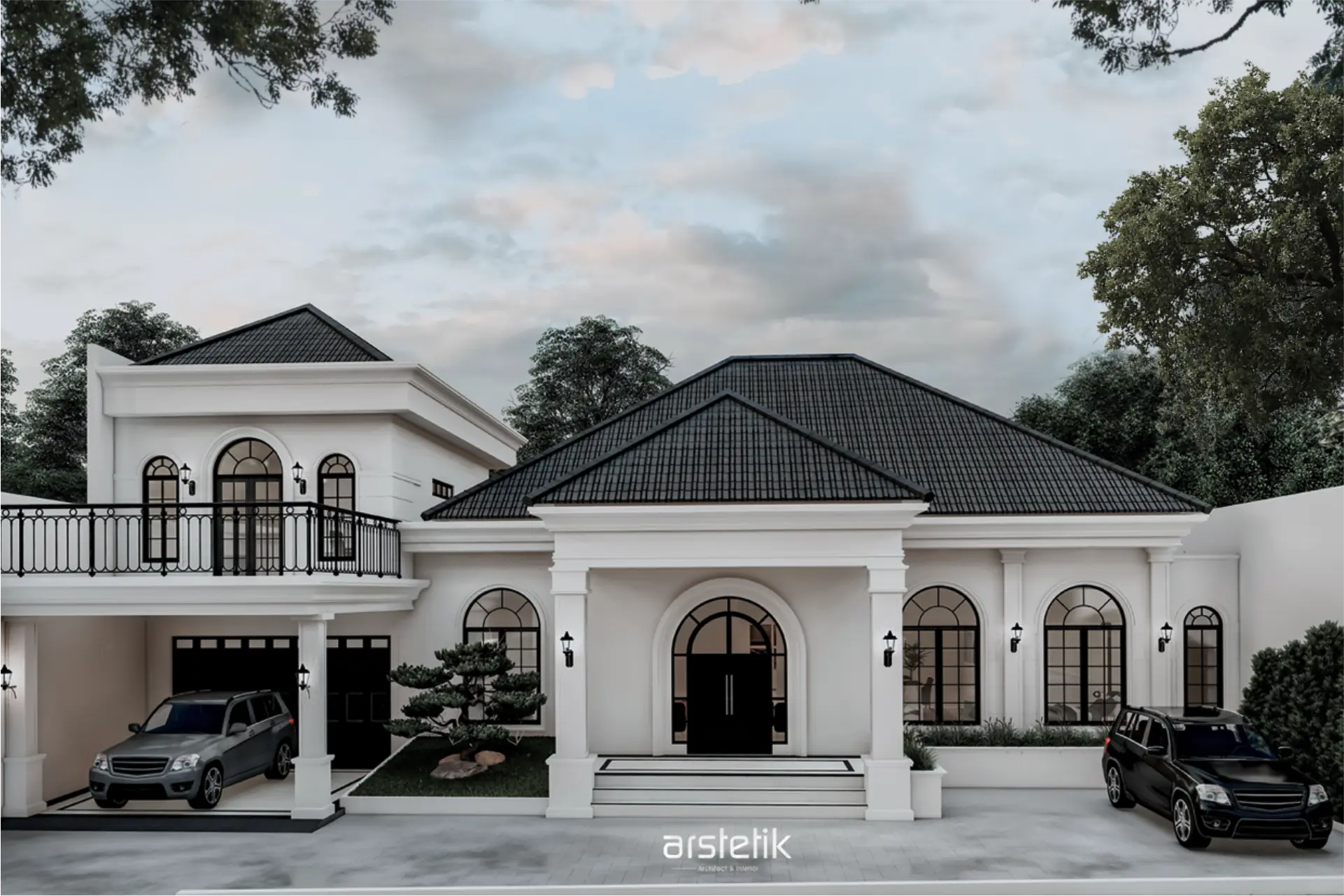 Elemen utama yang membentuk karakter rumah ini adalah penggunaan kolom-kolom klasik berprofil halus, dipadukan dengan bukaan jendela lengkung (arched windows) yang memperkuat nuansa estate Eropa. Warna fasad didominasi putih bersih untuk menonjolkan permainan bayangan pada profil dinding, sementara atap limasan bertekstur gelap memberikan kontras yang elegan.