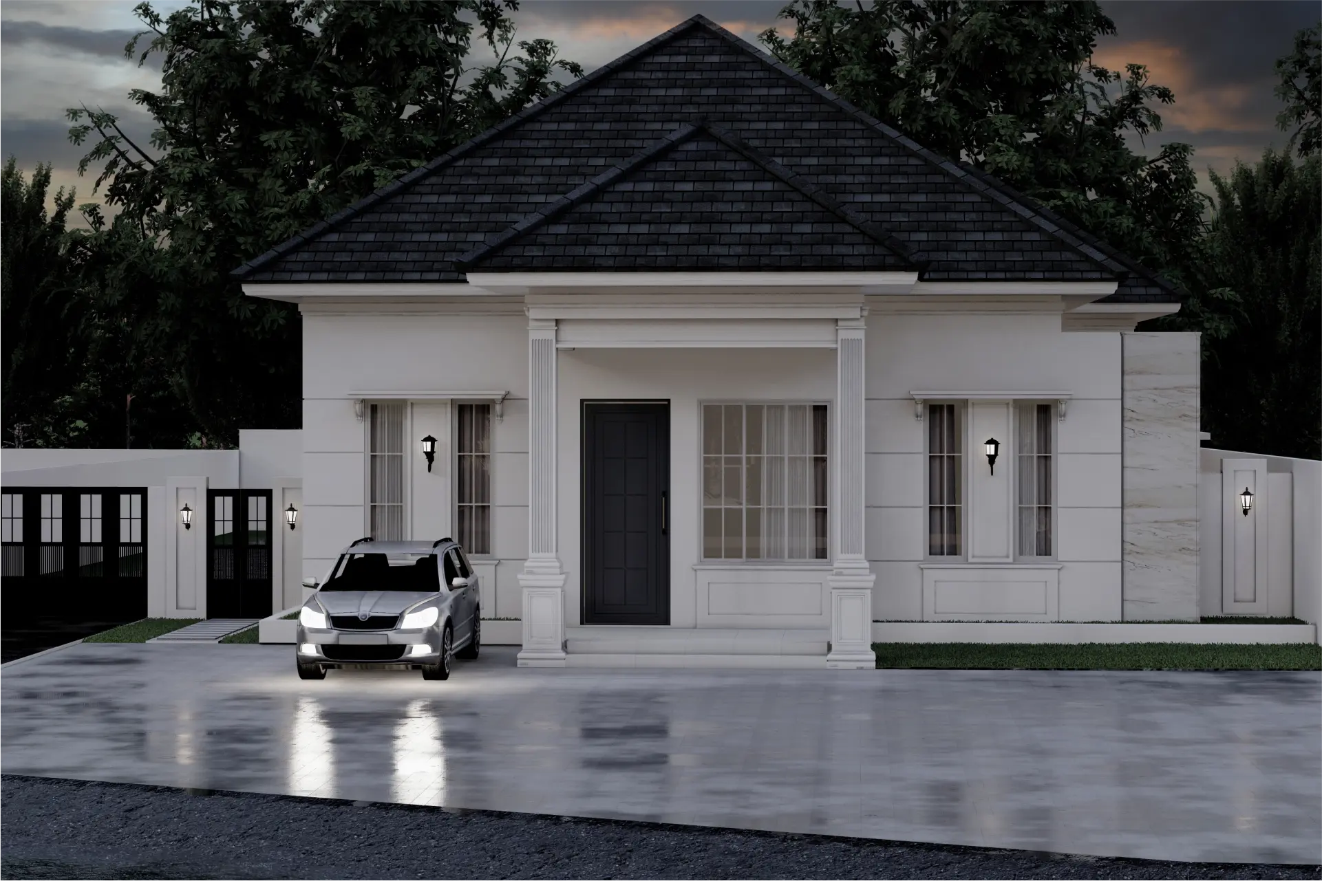 Bagian entrance menjadi pusat komposisi dengan kehadiran portico berkolom klasik yang memberikan kesan formal dan berwibawa. Penggunaan warna putih tulang pada dinding memperkuat kesan mewah yang tenang, sementara atap limasan bertekstur gelap menciptakan kontras visual yang kuat namun harmonis.